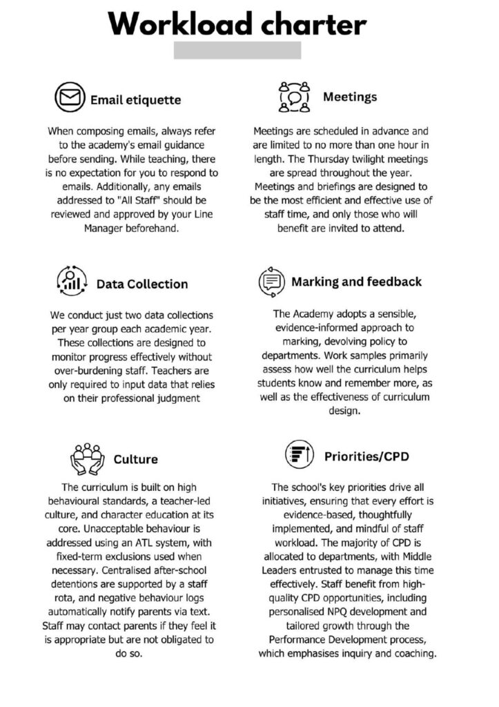 Our approach revolves around building high levels of professional trust, as research suggests that those working in supportive environments are more effective. To support our staff, we have outlined our commitments in the Workload Charter, which encapsulates our ethos and the actions taken to cultivate this culture.