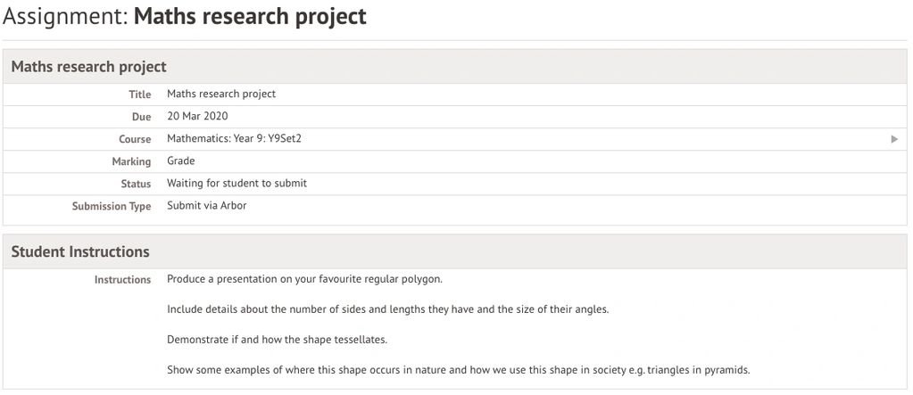 If you’ve got any homework (known as Assignments in Arbor), you’ll see this on your Arbor Dashboard. Click the assignment to view more details.